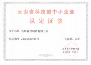 • ??? 2013年1月29日,昆明賽諾制藥有限公司榮獲云南省科技型中小企業(yè)認(rèn)定證書