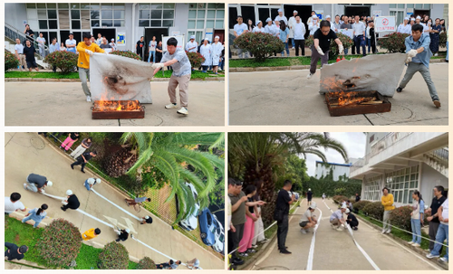 為準確把握和了解員工應急處置能力和水平,本次活動模擬火災發生,檢驗員工應對突發事件的處置和逃生能力。火災警報聲響起,員工們立即在指揮員的指揮下就近選擇逃生樓梯有序向樓下疏散,疏散過程中員工們壓低身子,用濕毛巾或衣物捂住口鼻,防止煙氣進入,整個過程井然有序。為了豐富員工對應急器材的使用及體驗,演練采用滅火毯進行滅火,加強應急處理方法。滅火毯滅火原理:覆蓋火源隔絕空氣、適用于初期火災、也可披在身上進行逃生,現場工作人員對滅火毯的使用方法和注意事項都進行了講解,讓員工現場進行實地體驗,2人一組、佩戴手套、進行滅火演練。